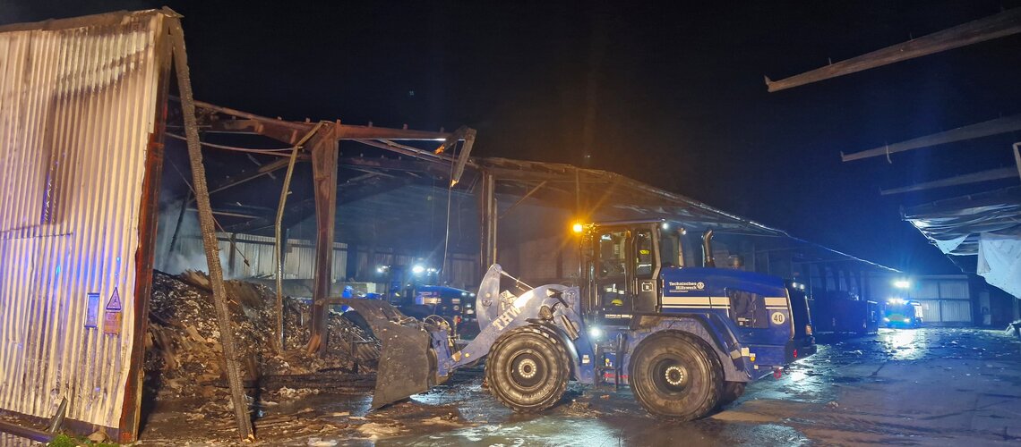 Zu einem Großbrand in einem Entsorgungsbetrieb wurde zur Unterstützung der Löscharbeiten auch der Radlader des THW Paderborn angefordert.