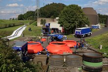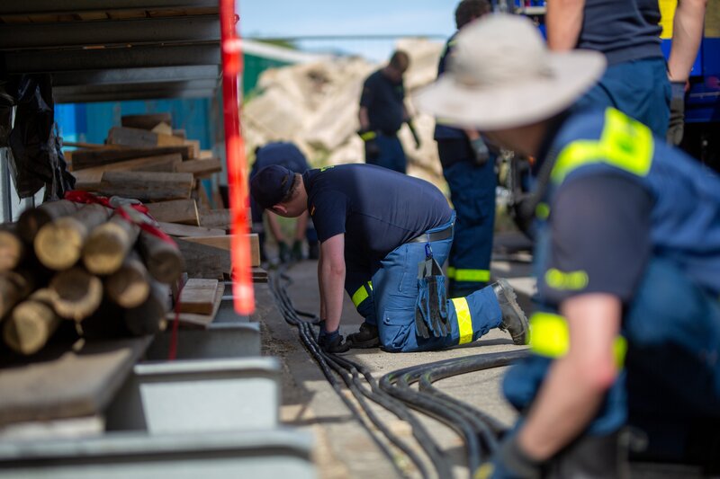 Insgesamt verlegten die Einsatzkräfte rund 3,3 km Schlauchstrecken und förderten mit ihren Pumpen bis zu 45.000 l/min, unter anderem in mehrere mobile 24.000 l-Becken.